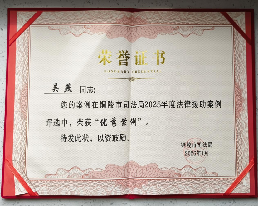 安徽廷和律师事务所吴燕律师承办案例荣获铜陵市2025年度法律援助优秀案例