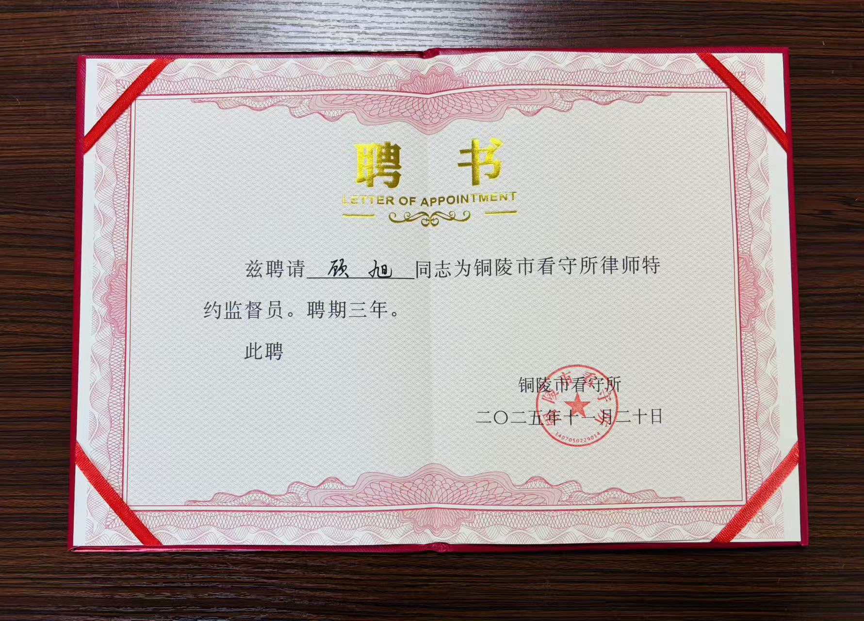 11月20日,铜陵市看守所为进一步强化执法监督、促进规范执法,聘请了一批律师担任特约监督员,安徽共正律师事务所主任顾旭荣幸受聘。顾律师表示十分珍惜这份荣誉与信任,担任监督员期间,将依据规定,对看守所的执法管理、在押人员合法权益保障以及律师执业权利落实情况等进行监督,认真履职,积极沟通。此次受聘,既是司法机关对安徽共正律师事务所律师专业素养与职业操守的认可,也是安徽共正律师事务所积极履行社会责任、参与法治共建的体现,安徽共正律师事务所将一如既往地为法治建设贡献“共正”力量。