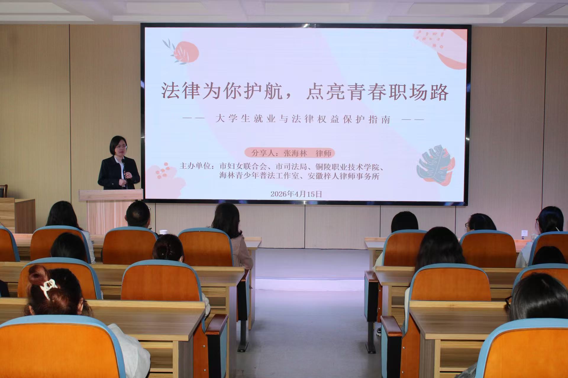4月15日下午,张海林走进铜陵职业技术学院,开展“巾帼护航”女大学生就业赋能专题法治讲座。课程聚焦女大学生求职就业过程中可能遇到的法律陷阱,围绕劳动合同签订、试用期权益、社保缴纳等热点问题进行了详细解读,并结合真实案例,揭示“霸王条款”“虚假招聘”等常见套路,提醒同学们擦亮认知、防范风险,筑牢校园法治安全防线。