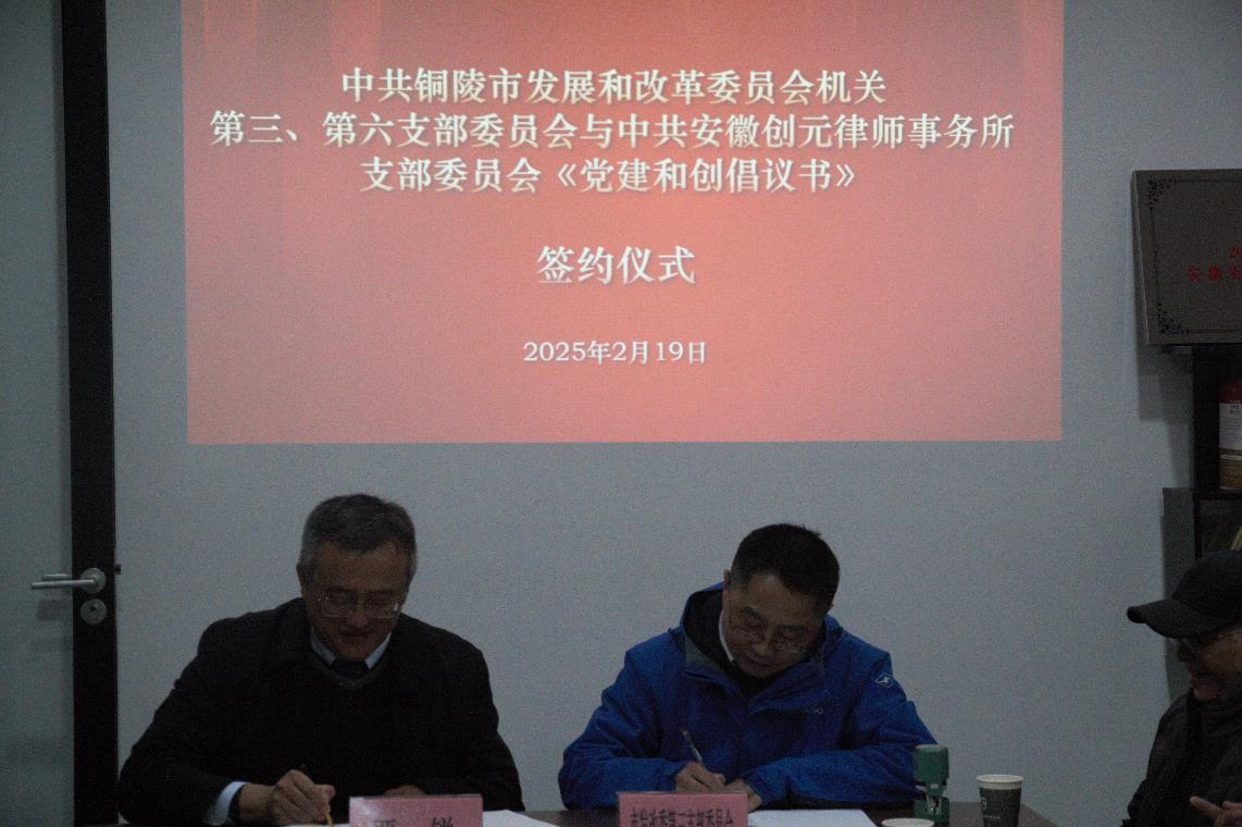 在与会党员的见证下,安徽创元律师事务所党支部与市发改委第三、六党支部签署了《党建和创倡议书》。这一举措标志着双方在党建合作方面迈出了坚实的一步,旨在通过党建引领,促进双方在业务交流、服务社会等多领域的深度融合,实现资源共享、优势互补、共同提高。
