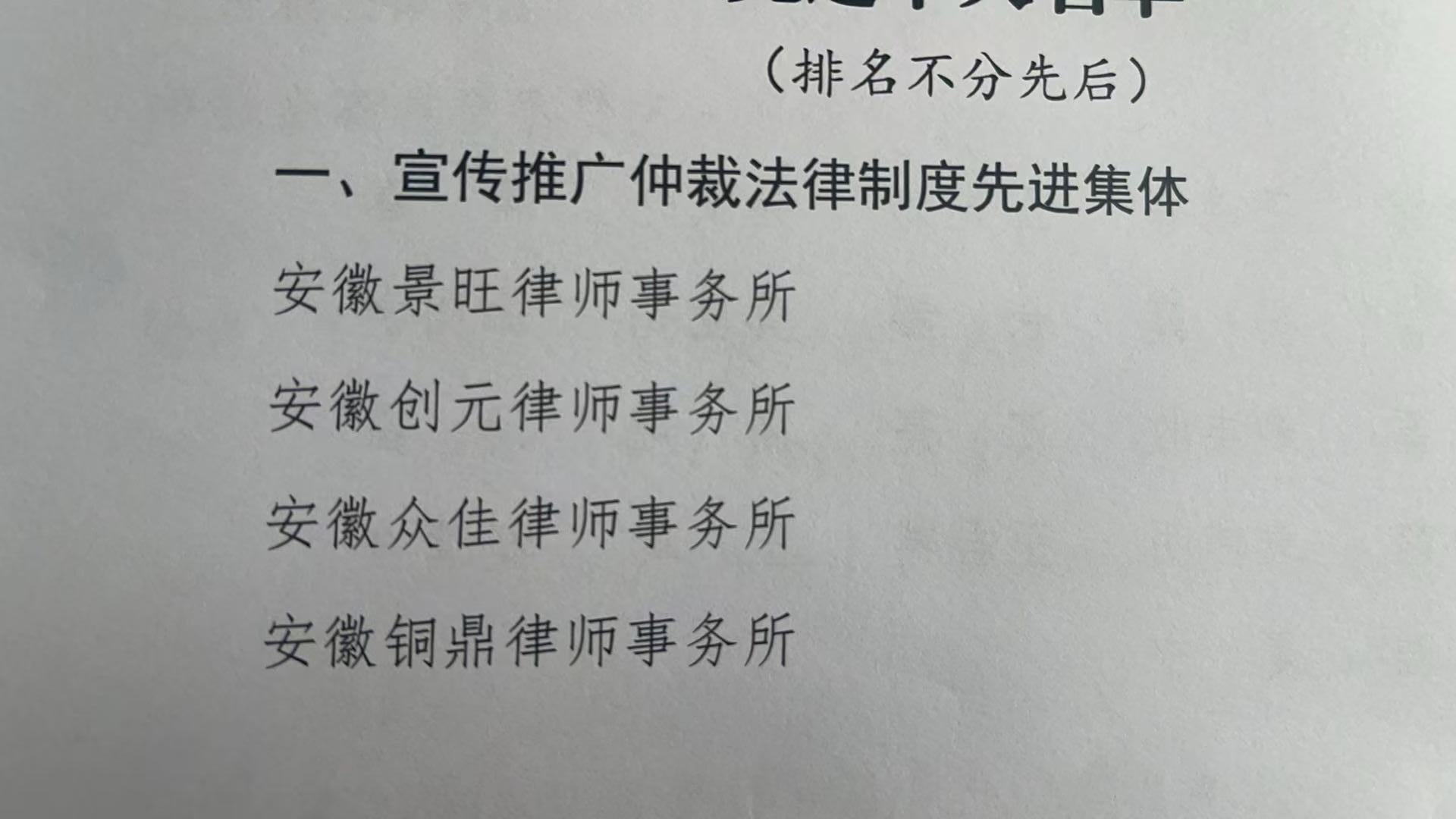安徽创元律师事务所的严锐律师获评“优秀仲裁员”,该律所雷胶东律师获评“宣传推广仲裁法律制度先进个人”。