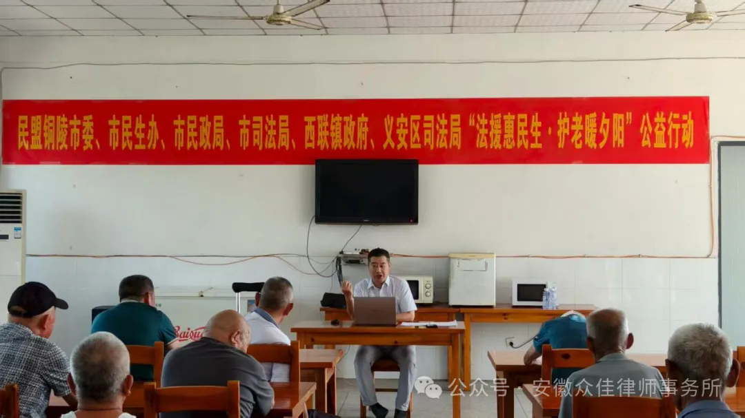 为深入贯彻落实法律援助惠民政策,切实保障老年人合法权益,营造尊老、敬老、爱老、助老的良好社会氛围,安徽众佳律师事务所联合市民生办、市民政局、市司法局、西联镇政府,于2025年8月29日上午在西联镇敬老院开展“法援惠民生·护老暖夕阳”走进乡村法律服务公益行动。此次活动旨在通过多种形式为乡村孤寡老人提供精准、便捷、温暖的法律服务,增强其法律意识和自我保护能力。
