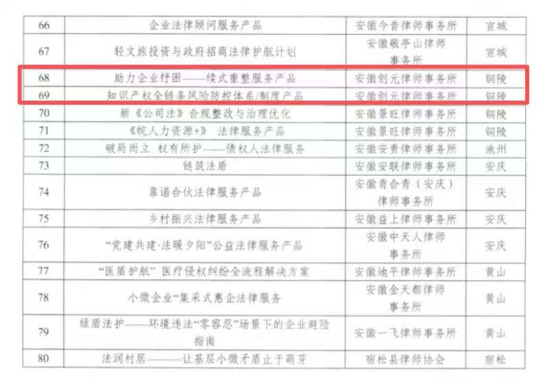 另外,由安徽创元律师事务所严锐律师、赵堃律师设计并提交的法律服务产品——“助力企业纾困:存续式重整服务产品”,凭借其创新的理念、专业的设计和显著的社会价值,成功入选首届全省律师行业法律服务产品创新大赛初赛名单。