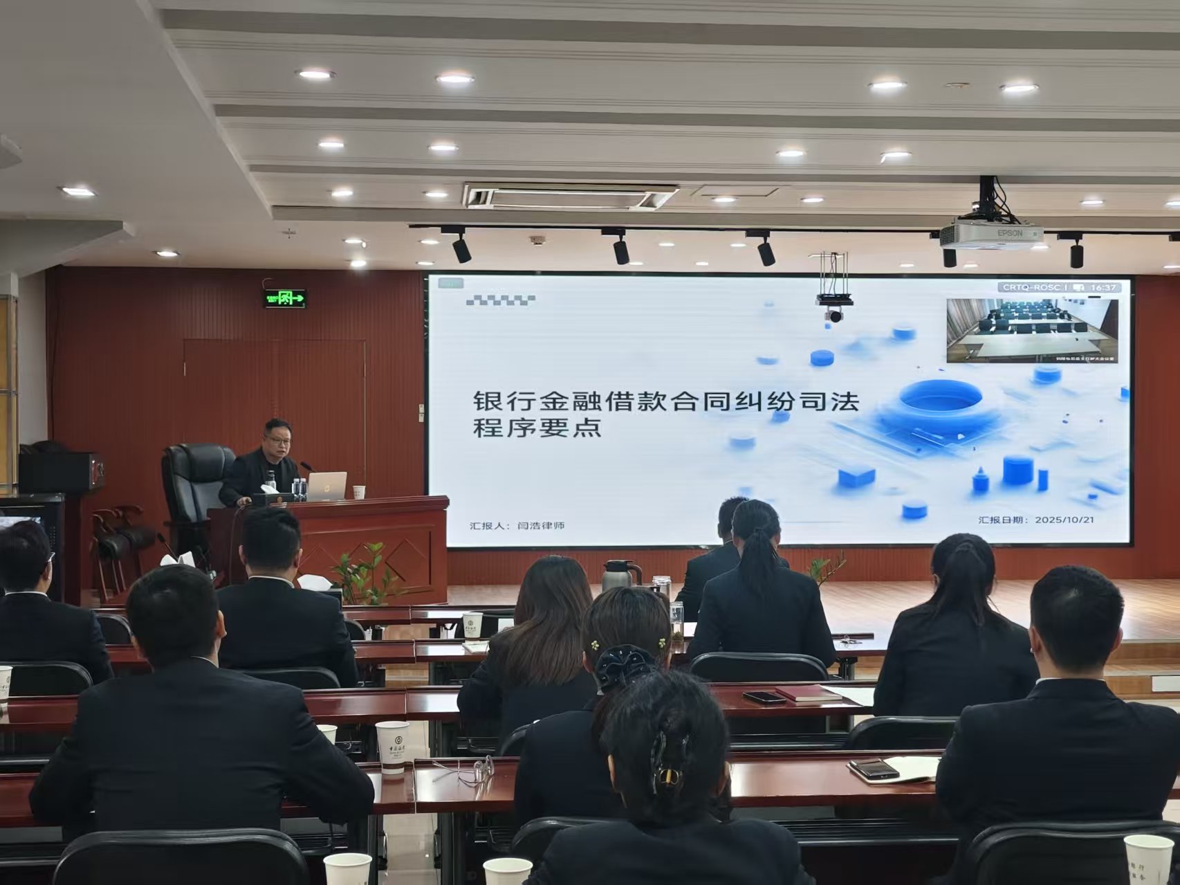 在当前经济形势下,银行金融借款合同纠纷呈现出新特点,对金融机构的资产安全与风险管控提出了更高要求。为精准应对司法实践中的挑战,强化相关从业人员的风险识别与案件处置能力,2025年10月21日,安徽景旺律师事务所监事会主任、金融与人力资源业务部负责人闫浩律师前往中国银行股份有限公司铜陵分行,举办了题为“银行金融借款合同纠纷司法程序要点”的专题培训。