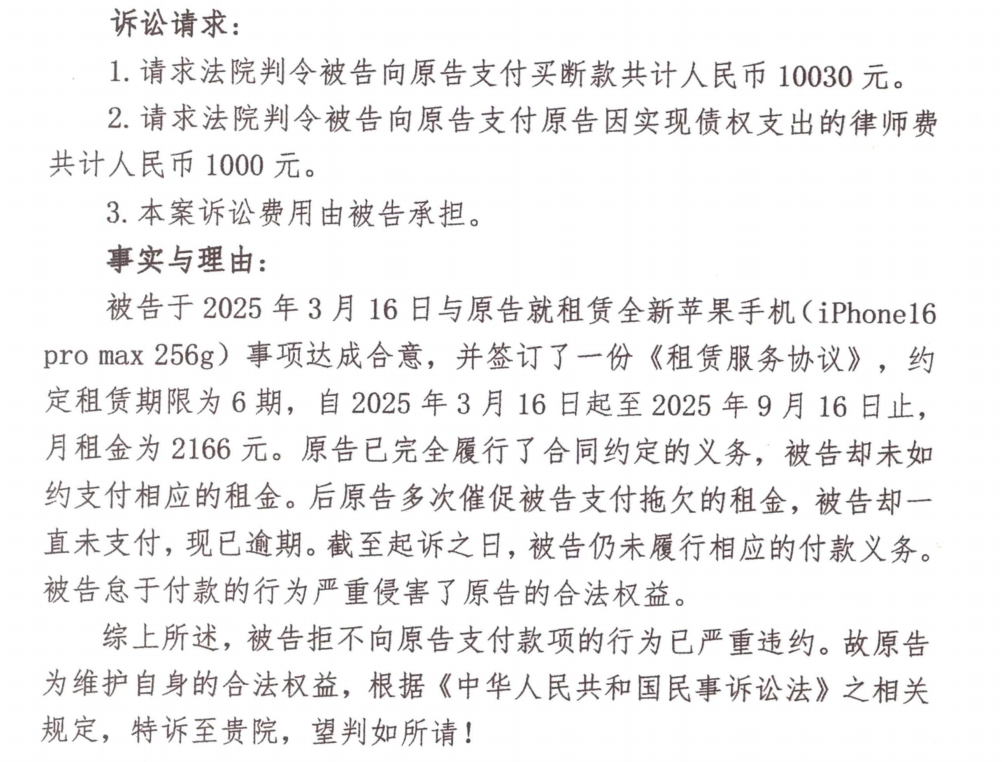 以上四幕,正是笔者当事人周女士(化名)的亲身经历。她因资金周转需求,被诱导签订了一份总价近13000元的手机《租赁服务协议》,而她实际到手的“借款”仅有7800元。在无力偿还高额“租金”后,一纸诉状将她推上了被告席。